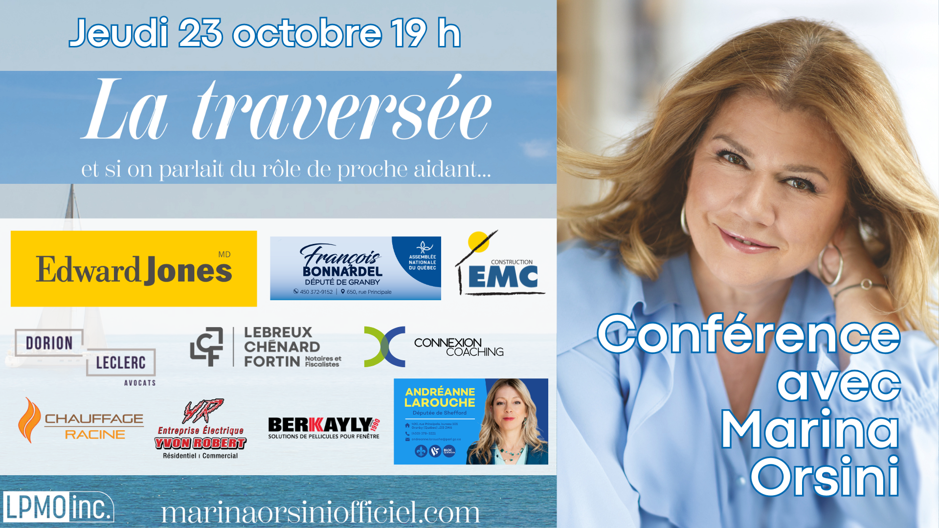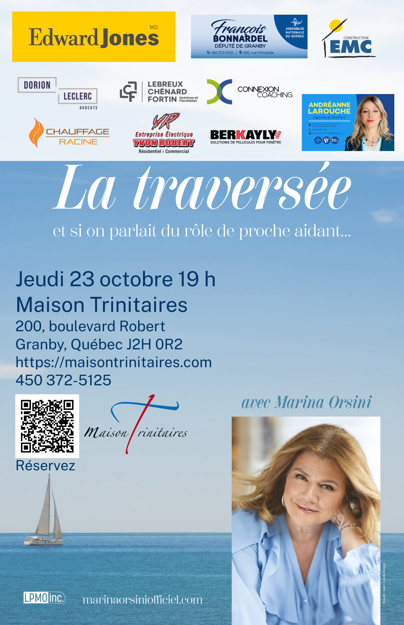 Dans cette conférence, Marina partage une période difficile de sa propre vie afin de sensibiliser le public à la réalité des proches aidants et à l’importance de mieux faire connaître les services offerts au Québec. Son objectif est clair : briser l’isolement, encourager les gens à demander de l’aide et leur fournir des outils concrets pour mieux vivre cette réalité. La Traversée : Et si on parlait du rôle de proche aidant… propose un moment d’échange unique et intime, propice à la confidence, entre Marina et le public.